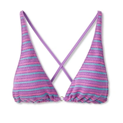 Add fashionable texture to your swim look with this Crochet Center Front Ring Triangle Bikini Top from Shade & Shore™. This triangle bikini top features blue and pink stripes over a crochet-textured purple backdrop, and has a metal ring front for chic flair. Made from soft and stretchy opaque fabric, it offers flexible comfort whether you are swimming or lounging on the shore. The crisscross back with an adjustable tie closure helps you find a custom fit, and the removable padded cups offer customizable coverage.