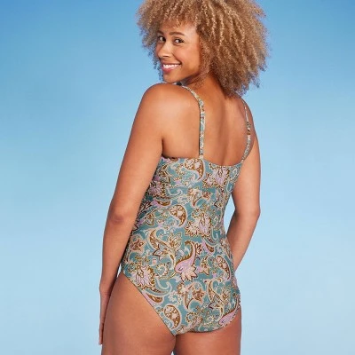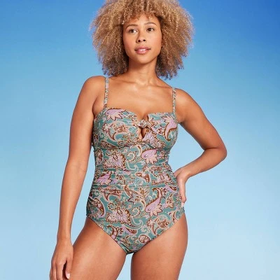 Add an effortlessly stylish piece to your swimwear collection with this Shirred Bandeau One-Piece Swimsuit from Shade & Shore™. This bandeau-style swimsuit designed to offer full coverage features a multicolored paisley pattern, a front bow with a V cutout detail and a shirred construction for flattering style. Made from stretchy fabric with elastic at the leg openings, it offers ease of movement in and out of the water. The open back with an adjustable strap makes it easy to find just the right fit, and the molded cups provide support and shaping.