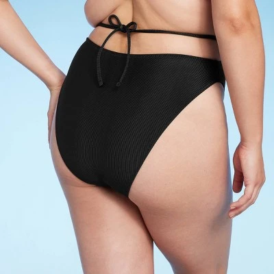 Add some textured style to your swim look with this Strappy Ribbed High Waist Extra High Leg Extra Cheeky Bikini Bottom from Shade & Shore™. This solid black bikini bottom features an extra cheeky high-waist cut with a high-leg design. It’s detailed with vertical ribbed texture and an attached strap accent that has to be tied around the waist to create chic style. The stretchy fabric with elastic at the leg openings lends comfortable movement, while the opaque construction offers coverage for confident wear. Pair with the available matching bikini top for a coordinated look, or with other solid or patterned swim tops for an endless array of styling options.