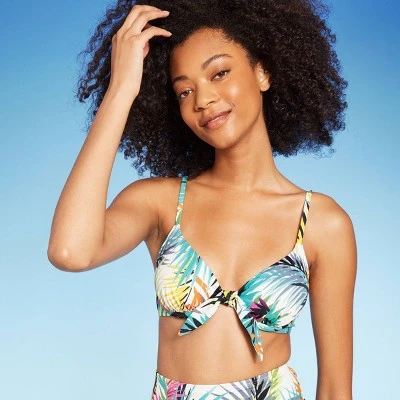 Bring a touch of tropical style to your swim separates with this Tie Detail Underwire Bikini Top from Shade & Shore™. Made from soft fabric with spandex and full lining, this bikini top gives you flexible movement in and out of the water. Removable padding offers customizable coverage, and the underwire construction provides you with the right amount of support. Decorated with allover multicolor palm print for fun, summery vibes, the top also features adjustable straps to help you find the perfect fit, and a front tie detail finishes off the look with a chic touch.