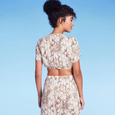 Stay in style while flaunting your standout look by wearing the Tie-Front Short-Sleeve Cover-Up Crop Top from Shade & Shore™. This short-sleeve cover-up top features snake print in tan and cream hues for an elegant look. The deep V-neckline with tie front elevates the look, while the 100% rayon fabric provides all-day comfort. Simply pair it with the snake-print bottom to complete the look.
